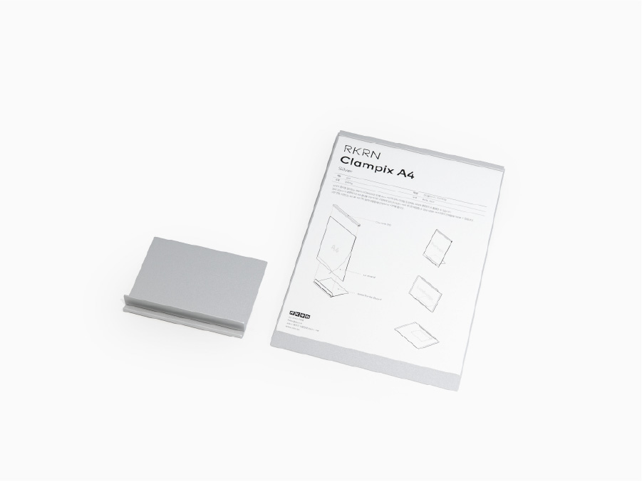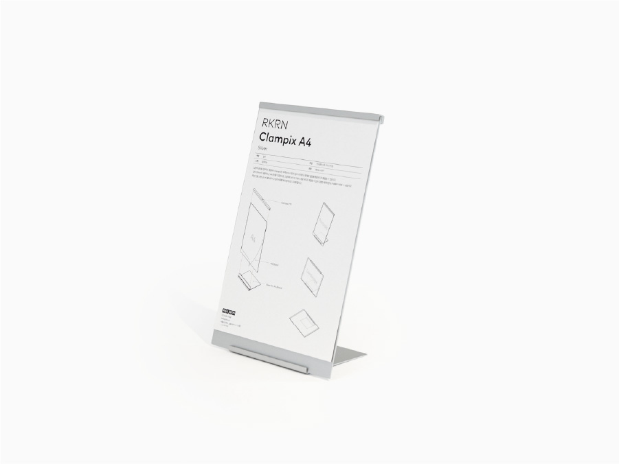 종이를 고정하는 작은 하드웨어는 단독으로 사용할 수 있을 뿐 아니라, 스탠딩 안내판으로 크기를 확장하고 유인물 수납 기능까지 더할 수 있는 구조로 제작되었습니다. 사용성에 집중하면서도 다방면으로 활용하기를 좋아하는 RKRN 디자인의 특징을 녹여낸 시도입니다.